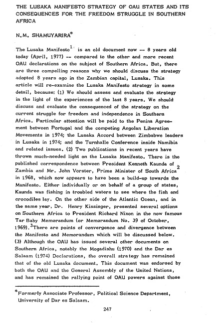 The Lusaka Manifesto strategy of OAU states and its consequences for the freedom struggle in Southern Africa