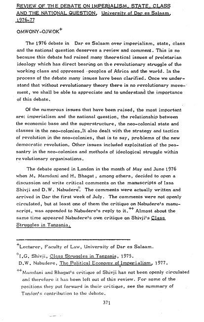 Review of the debate on imperialism, state, class and the national question, University of Dar es Salaam, 1976-77