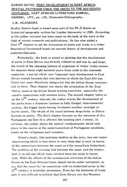 Review of: Bashir Ahmed Datoo. Port development in east Africa. Nairobi: East African Literature Bureau, 1975
