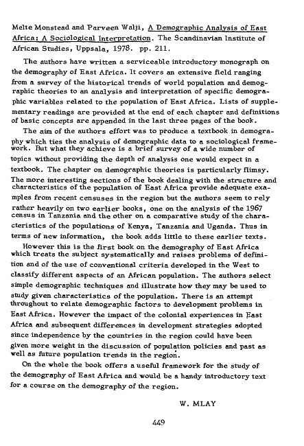 Review of: Mette Mønsted & Parveen Walji. A demographic analysis of East Africa. Uppsala: Scandinavian Institute of African Studies, 1978
