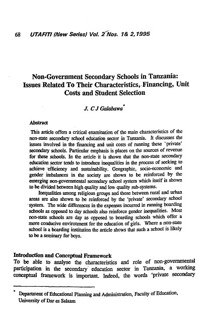 This article offers a critical examination of the main characteristics of the non-state secondary school education sector in Tanzania. It discusses the issues involved in the financing and unit costs of running these "private" secondary schools. Particular emphasis is places on the sources of revenue for these schools. In the article it is shown that the non-state secondary education sector tends to introduce inequalities in the process of seeking to achieve efficiency and sustainability. Geographic, socio-economic and gender imbalances in the society are shown to be reinforced by the emerging non-governmental secondary school system which itself is shown to be divided between high quality and low quality sub-systems. Inequalities among religious groups and those between rural and urban areas are also shown to be reinforced by the "private" secondary school system. The wide differences in the expenses incurred in running boarding schools as opposed to day schools also reinforces gender inequalities. Most non-state schools are day as opposed to boarding schools which offer a more conducive environment for the education of girls. Where a non-state school is a boarding institution the article shows that such a school is likely to be a seminary for boys.