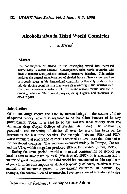 The consumption of alcohol in the developing world has increased dramatically in recent decades. Consequently, third world countries will have to contend with problems related to excessive drinking. This article analyses the gradual transformation of alcohol from an "integrative" pastime to a costly abuse as big international companies deliberately push alcohol into developing countries at a time when its marketing in the industrialised countries themselves is under attack. It lists the reasons for the increase in drinking habits of third world peoples, citing Nigeria and Tanzania as cases in point.