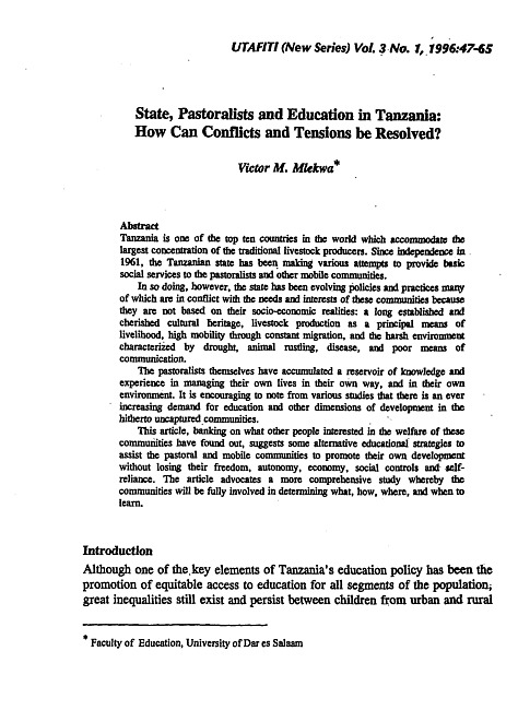 Tanzania is one of the top ten countries in the world which accommodate the largest concentration of the traditional livestock producers. Since independence in 1961, the Tanzanian state has been making various attempts to provide basic social services to the pastoralists and other mobile communities. In so doing, however, the state has been evolving policies and practices many of which are in conflict with the needs and interests of these communities because they are not based on their socio-economic realities: a long established and cherished cultural heritage, livestock production as a principal means of livelihood, high mobility through constant migration, and the harsh environment characterized by drought, animal rustling, disease, and poor means of communication. The pastoralists themselves have accumulated a reservoir of knowledge and experience in managing their own lives in their own way, and in their own environment. It is encouraging to note from various studies that there is an ever increasing demand for education and other dimensions of development in the hitherto uncaptured communities. This article, banking on what other people interested in the welfare of these communities have found out, suggests some alternative educational strategies to assist the pastoral and mobile communities to promote their own development without losing their freedom, autonomy, economy, social controls and self-reliance. The article advocates a more comprehensive study whereby the communities will be fully involved in determining what, how, where, and when to learn.