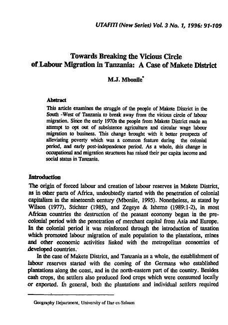This article examines the struggle of the people of Makete District in the South -West of Tanzania to break away from the vicious circle of labour migration. Since the early 1970s the people from Makete District made an attempt to opt out of subsistence agriculture and circular wage labour migration to business. This change brought with it better prospects of alleviating poverty which was a common feature during the colonial period, and early post-independence period. As a whole, this change in occupational and migration structures has raised their per capita income and social status in Tanzania.