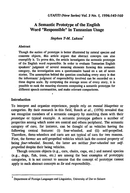 Though the notion of prototype is better illustrated by natural species and concrete objects, this article argues that abstract concepts can also exemplify it. To prove this, the article investigates the semantic prototype of the English word responsible. In order to evaluate Tanzanian English speakers' judgment of several meaning elements forming this semantic category, the investigation uses a questionnaire based on a set of seven stories. The assumption behind the question concluding every story is that the informants' judgment of responsibility involved can be recorded on a three degree scale. By computing the average score of every story, it is possible to rank the meaning elements composing a semantic prototype for different speech communities, and make relevant comparisons.