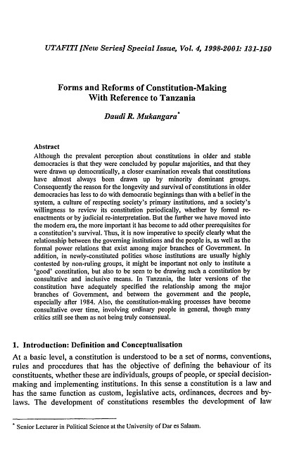 Although the prevalent perception about constitutions in older and stable democracies is that they were concluded by popular majorities, and that they were drawn up democratically, a closer examination reveals that constitutions have almost always been drawn up by minority dominant groups. Consequently the reason for the longevity and survival of constitutions in older democracies has less to do with democratic beginnings than with a belief in the system, a culture of respecting society's primary institutions, and a society's willingness to review its constitution periodically, whether by formal reenactments or by judicial re-interpretation. But the further we have moved into the modern era, the more important it has become to add other prerequisites for a constitution's survival. Thus, it is now imperative to specifYclearly what the relationship between the governing institutions and the people is, as well as the formal power relations that exist among major branches of Government. In addition, in newly-constituted polities whose institutions are usually highly contested by non-ruling groups, it might be important not only to institute a "good" constitution, but also to be seen to be drawing such a constitution by consultative and inclusive means. In Tanzania, the later versions of the constitution have adequately specified the relationship among the major branches of Government, and between the government and the people, especially after 1984. Also, the constitution-making processes have become consultative over time, involving ordinary people in general, though many critics still see them as not being truly consensual.