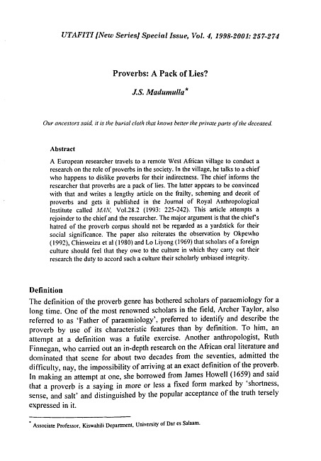 A European researcher travels to a remote West African village to conduct a research on the role of proverbs in the society. In the village, he talks to a chief who happens to dislike proverbs for their indirectness. The chief informs the researcher that proverbs are a pack of lies. The latter appears to be convinced with that and writes a lengthy article on the frailty, scheming and deceit of proverbs and gets it published in the Journal of Royal Anthropological Institute called MAN. Vo1.28.2 (1993: 225-242). This article attempts a rejoinder to the chief and the researcher. The major argument is that the chief's hatred of the proverb corpus should not be regarded as a yardstick for their social significance. The paper also reiterates the observation by Okpewho (1992), Chinweizu et al (1980) and Lo Liyong (1969) that scholars of a foreign culture should feel that they owe to the culture in which they carry out their research the duty to accord such a culture their scholarly unbiased integrity.