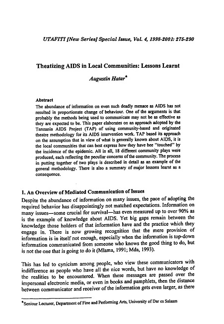 The abundance of information on even such deadly menace as AIDS has not resulted in proportionate change of behaviour. One of the arguments is that probably the methods being used to communicate may not be as effective as they are expected to be. This paper elaborates on an approach adopted by the Tanzania AIDS Project (TAP) of using community-based and originated theatre methodology for its AIDS intervention work. TAP based its approach on the assumption that in view of what is generally known about AIDS, it is the local communities that can best express how they have been "touched" by the incidence of the epidemic. All in all, 18 different community plays were produced, each reflecting the peculiar concerns of the community. The process in putting together of two plays is described in detail as an example of the general methodology. There is also a summary of major lessons learnt as a consequence.