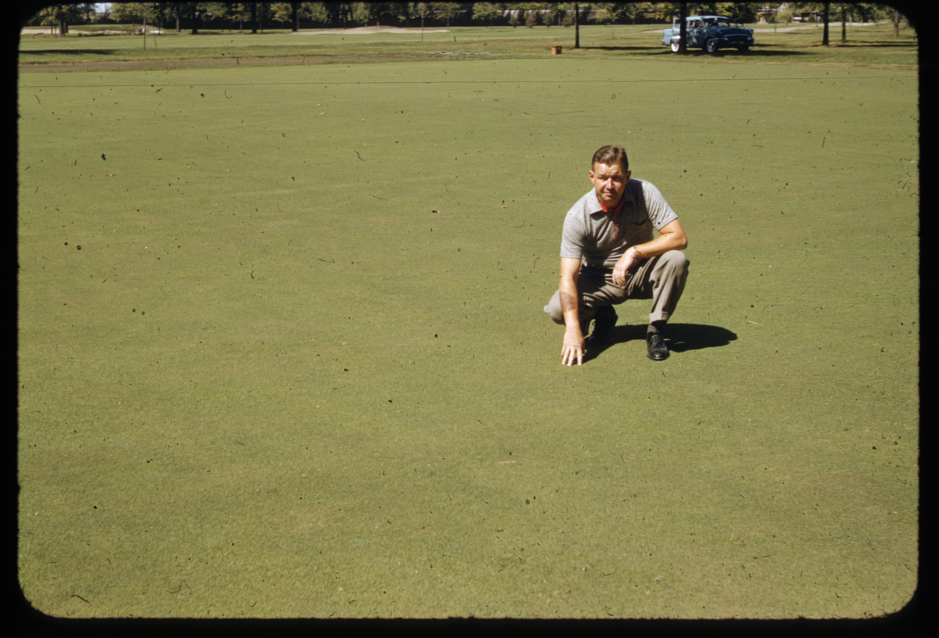 Golf Course Superintendent Bob Williams stooping on the large turf nursery at the Beverly Country Club, Chicago, in 1955. The nursery included Merion Kentucky bluegrass, C-15 (Toronto) creeping bentgrass, and zoysia. Spiffy blue vehicle in the background.