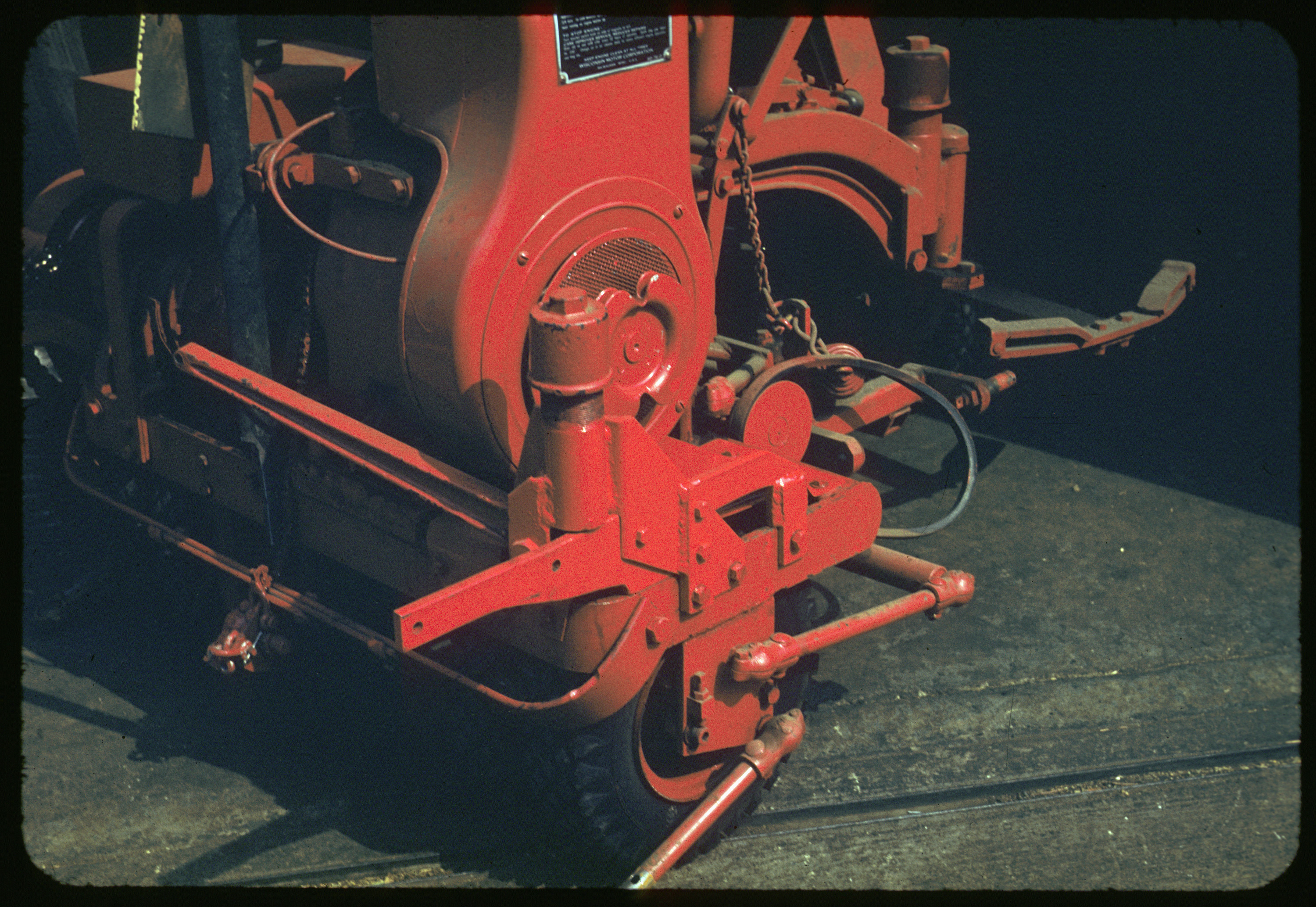 Mid-range view of a Toro mower with a chrome moly front catcher bracket, 1953