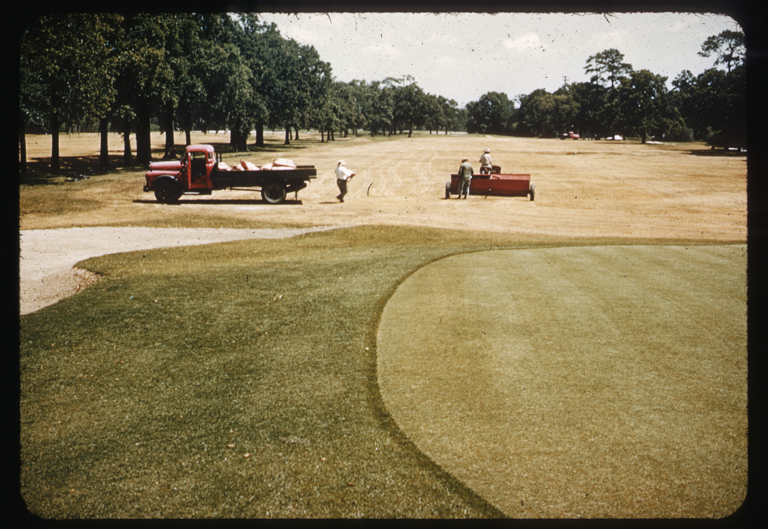 Three men at work fertilizing the #14 Fairway of the then Houston Country Club in Texas, 1952. View from behind the green looking back up the fairway, with truck full of material parked on the fairway and spreader pointed away. Fairway uniformly straw-colored ("temp. burn" on Berm[uda]").