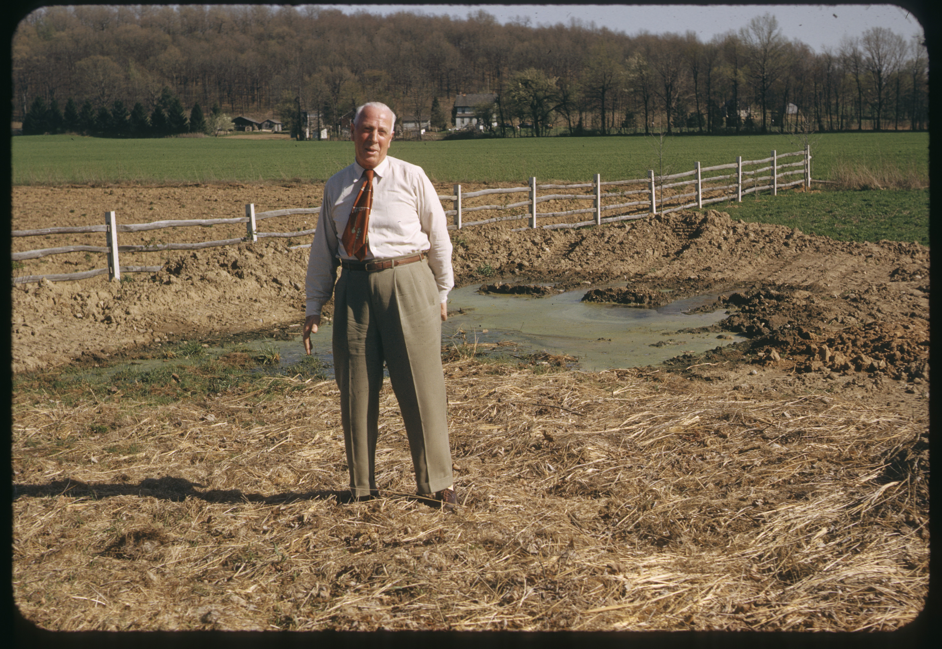 Golf course superintendent Leonard Strong at the Saucon Valley Country Club, Pennsylvania, composting facility in 1954. All organic refuse and clippings are dumped into a depression.